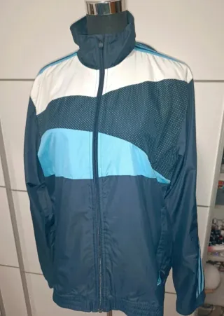 Chaqueta deportiva estilo retro vintage de Adidas. Talla XL, aunque tira a una M/L Medidas Ancho 60. Largo 69. Color azul marino, azul claro y granate