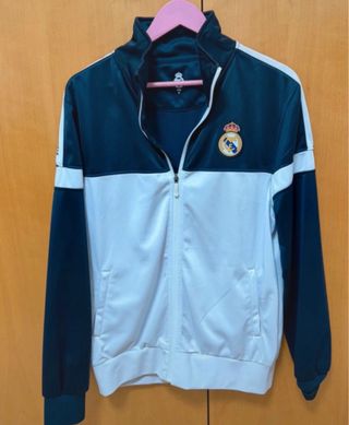 Chaqueta deportiva del Real Madrid con diseño clásico. - Tres rayas negras en las mangas. - Escudo del Real Madrid y logo de la Champions League. - Cremallera frontal completa. - Bolsillos laterales con cremallera.