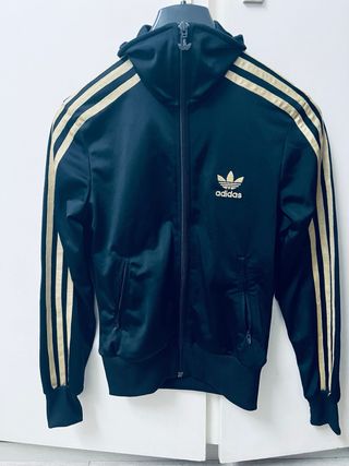 Chaqueta de chándal vintage con el icónico logo de Adidas. - Diseño clásico. - Detalle del logo en color dorado. - Puños y cintura elásticos.