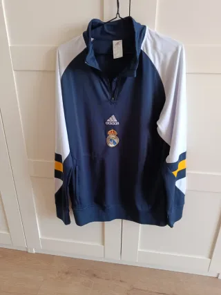 Chándal del Real Madrid, a estrenar. - Diseño con cremallera parcial. - Mangas blancas con detalles. - Escudo del equipo.