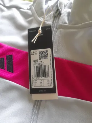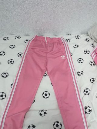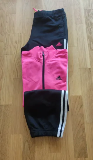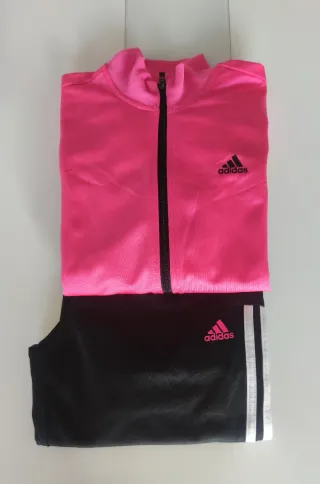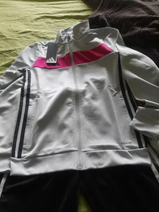 Conjunto deportivo Adidas con chaqueta y pantalón. - Chaqueta con cremallera completa y cuello alto. - Diseño con detalles en color rosa. - Pantalón de corte recto. - Rayas deportivas en los laterales. Fue un regalo