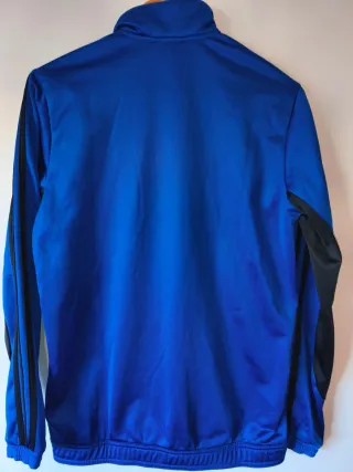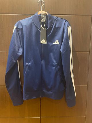 Chándal deportivo Adidas de color azul y rallas blancas. Está sin estrenar y con etiquetas. - Diseño con las icónicas tres rayas blancas en las mangas. - Cierre de cremallera frontal. - Cuello y puños elásticos.