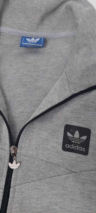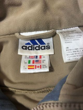 Conjunto deportivo Adidas de color beige. - Cremallera frontal completa. - Cuello alto con ribete azul. - Tejido de forro polar suave. - FALTA EL TIRADOR DE LA CREMALLERA, el resto está perfecto.