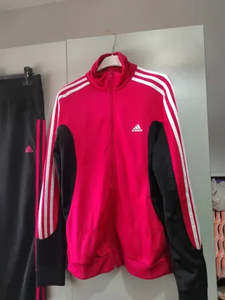Conjunto deportivo Adidas para mujer color fucsia y negro. Ver última foto para color. - Chaqueta con cremallera completa. - Pantalón con detalles laterales. - Logo de Adidas en ambas prendas.