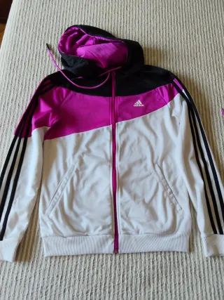 Chándal Adidas de color rosa. Nuevo, SIN ESTRENAR. Sudadera talla L. Pantalón talla XL Se puede negociar la compra de una de las dos prendas únicamente. - Cintura elástica con cordón. - Bolsillos laterales con cremallera. - Detalle de franjas negras en las perneras. - Logo de Adidas en la pierna.