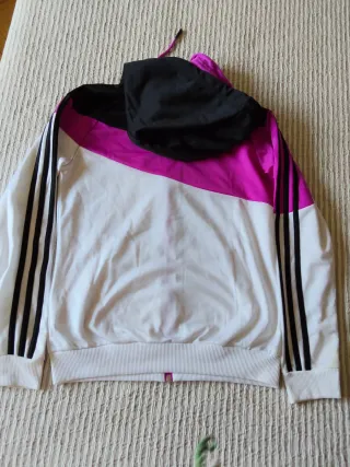 Chaqueta deportiva Adidas con un diseño vibrante y detalles distintivos. - Mangas con las icónicas tres rayas. - Paneles laterales en diferentes tonos de rosa. - Capucha integrada para mayor comodidad. - Logo de Adidas en el pecho.