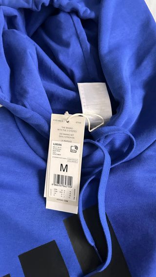 Sudadera con capucha y logo grande de Adidas. - Color azul vibrante. - Logo de Adidas en negro. - Capucha con cordones ajustables.