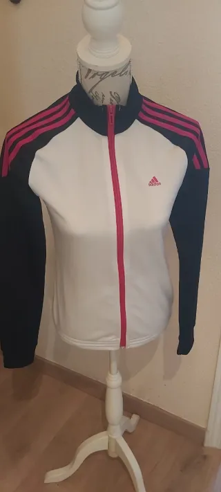 Preciosa chaqueta deportiva Adidas, color rosa intenso/fucsia. Ideal para un look retro o casual con un toque de color. ¡Nueva, sin usar! Perfecta para hacer deporte o para el día a día. Talla: L (EU 40/M) pero vale para una M también. Detalles: Clásico logo Adidas y las tres bandas blancas en las mangas. Corte: Cremallera completa y cuello alto. Interior forrado con malla (mesh) transpirable. Una pieza icónica, muy cómoda y de calidad. ¡Añade un toque vibrante a tu armario! 💓🎁✨ #Adidas #ChaquetaDeportiva #Fucsia #TallaM #ChaquetaRetro #RopaNueva #AdidasOriginals