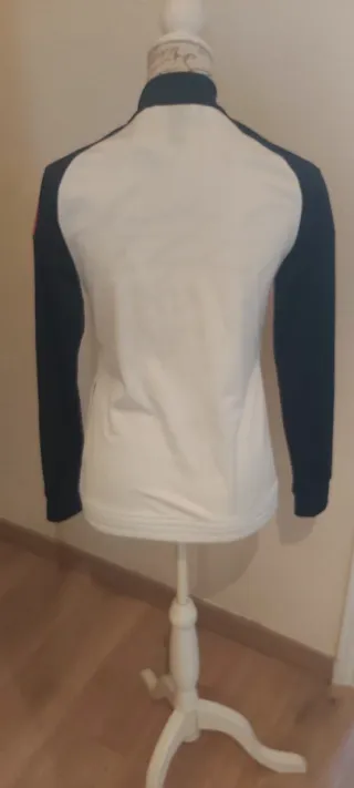 Chaqueta deportiva Adidas de color blanco con detalles en rojo y negro. Talla S, da mucha talla - Cuello y puños con bandas. - Cierre de botones a presión. - Logo de Adidas en relieve en el pecho.