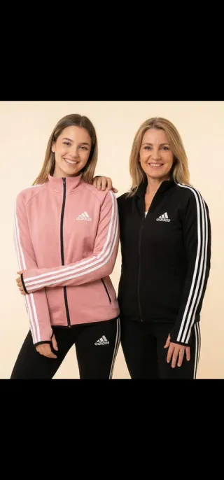 Conjunto deportivo Adidas para mujer color fucsia y negro. Ver última foto para color. - Chaqueta con cremallera completa. - Pantalón con detalles laterales. - Logo de Adidas en ambas prendas.
