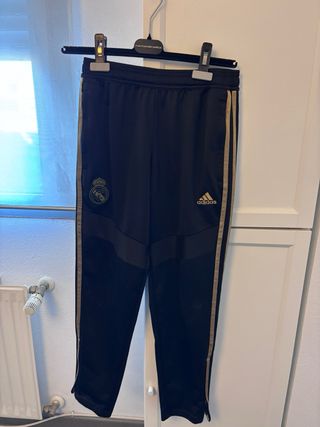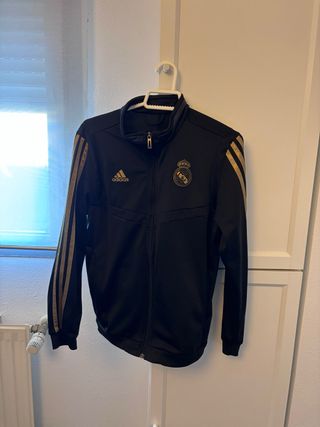 Chándal oficial del Real Madrid con detalles dorados. Talla 11-12 Una rodilla está un poco rozada - Diseño con las icónicas tres rayas de Adidas en las mangas. - Escudo del Real Madrid bordado en el pecho. - Cierre de cremallera frontal.