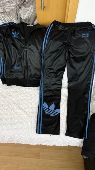 Chándal original de Adidas, prácticamente nuevo, sin ninguna señal de uso. Pantalón negro y sudadera azul y negra Talla 15-16 hasta 176 cm. Elástico en puños, cintura y tobillos.