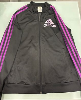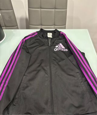 Chándal Adidas negro con detalles en morado.