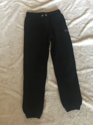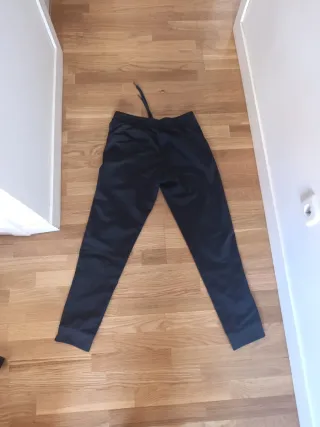 Pantalón de chándal Adidas en color negro con detalles de rayas. - Diseño clásico con tres rayas laterales. - En perfecto estado. - Cintura elástica para mayor comodidad. - Logo de Adidas visible. - tiene dos mecánicos para ajustar los bajos. - Bolsillos con cremallera. - Talla S . Mide: 38 cm cintura 60 cm cadera 105 cm largo