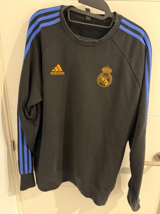 Conjunto de chándal del Real Madrid. - Diseño con franjas azules en las mangas y los laterales. - Escudo del Real Madrid y logo de Adidas. - Color principal negro. Pantalón talla L y sudadera talla M.