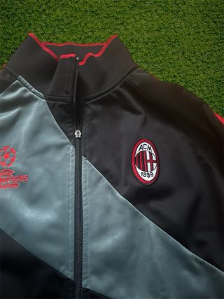 Chaqueta deportiva AC Milan en color negro con detalles en rojo y gris, diseño oficial tipo entrenamiento. Ideal para uso diario, deporte o colección de fútbol. La prenda se encuentra en buen estado general, con un único detalle a tener en cuenta: 🔹 La cremallera no está completa, pero sube y baja correctamente y se puede usar sin problema. Tejido cómodo, ligero y resistente, con bolsillos laterales y cuello alto. Diseño clásico y muy llamativo para fans del Milan o del fútbol en general. 📏 Medidas: • Ancho (axila a axila): 53 cm • Largo (desde el cuello): 73 cm ✔️ Cremallera funcional ✔️ Buen estado general ✔️ Ideal para uso diari