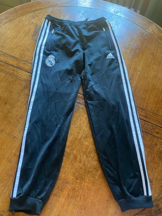 Pantalón de chándal Adidas para niño, en color negro. Está en buen estado. - Tiene bolsillos laterales. - Lleva las tres bandas características de Adidas en los laterales. - Presenta el escudo del Real Madrid en la pierna izquierda.