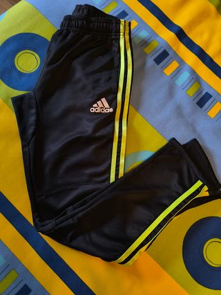 Pantalones deportivos Adidas, color negro y verde fosforito. Talla XS adulto, equivale a una M de niño.Están en buen estado y son ideales para practicar deporte o para el uso diario. - Diseño deportivo y cómodo. - Tres franjas verdes a los lados. - Cintura elástica. Mas ropa en mi perfil. Escucho ofertas de todo lo que tengo