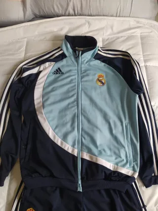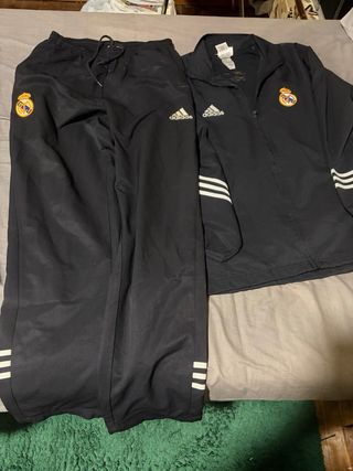Conjunto deportivo Adidas del Real Madrid en talla XL. Diseño moderno con detalles en contraste. - Tejido cómodo y transpirable. - Escudo del equipo. - Cintura elástica con cordón ajustable. - Cremallera en los bajos del pantalón. - En perfecto estado de conservación. - Envíos sólo vía Inpost