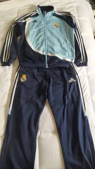Conjunto deportivo original del Real Madrid. - Parte superior blanca con detalles azules. - Pantalón azul. - Logo del Real Madrid y Adidas.