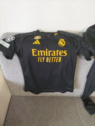 Conjunto de camiseta y pantalón de chándal del Real Madrid. - Camiseta negra con detalles dorados. Talla 11/12 - Pantalón de chándal negro. - Logo de Adidas y escudo del Real Madrid. Talla 9/10 5€ CADA PIEZA 5€ la camiseta 5€ el conjunto de chándal