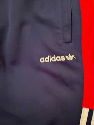 Chándal vintage de Adidas con un diseño clásico. - Color azul marino con detalles en rojo y blanco. - Cremallera frontal. - Cuello alto. - Puños y cintura elásticos.