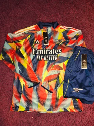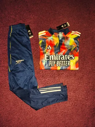 Conjunto de chándal del Arsenal. - Parte superior roja con mangas blancas y detalles negros. - Pantalón largo azul marino con detalles blancos. - Logos de Adidas y escudo del Arsenal visibles.