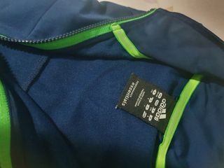 Chándal manga larga, en azul y verde, de la marca Adidas. Bolsillos laterales y puños tanto en chaqueta como en pantalón largo.
