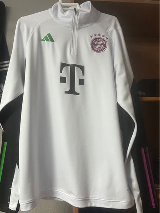 Chándal oficial del Bayern de Múnich con media cremallera. - Diseño deportivo en blanco y negro. - Logo de Adidas y escudo del club. - Detalle de T-Mobile en el frontal. - Posibilidad de incluir el pantalón. - Preguntar por el chándal entero.