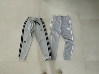 Pantalón de chándal Adidas (originales) - Diseño con tres rayas laterales. - Cintura elástica con cordón ajustable. - Logo de Adidas en la pierna. Como se puede apreciar en la foto ambos tienen un pequeño roto en la pierna derecha, por lo demás están impecables. 10€ los dos