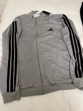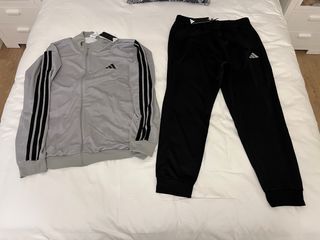 Conjunto deportivo Adidas compuesto por chaqueta y pantalón. - Chaqueta gris con detalles de rayas negras en las mangas. - Pantalón negro. - Logos de Adidas en ambas prendas. Comprado en Sprinter, no se ha devuelto por pasar el periodo de 30 días