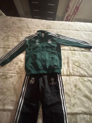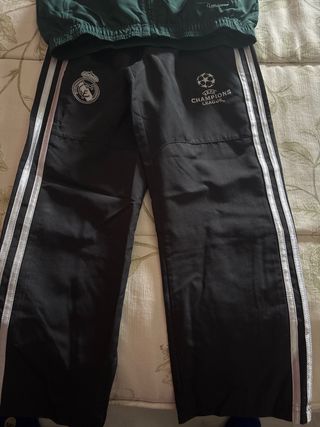 Conjunto de chándal retro del Real Madrid de la temporada 2012/2013 edición champions. - Diseño con las icónicas tres rayas laterales. - Escudo del Real Madrid bordado. - Logo de la UEFA Champions League. - Precio negociable