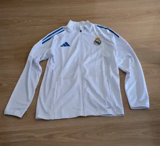 Chándal oficial del Real Madrid. - Diseño con las icónicas tres rayas de Adidas en las mangas. - Escudo del Real Madrid bordado en el pecho. - Cremallera frontal completa.