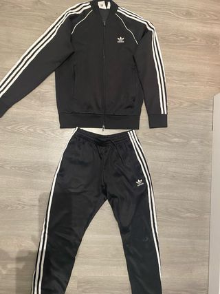Conjunto deportivo Adidas de dos piezas. - Chaqueta con cremallera completa. - Pantalón con cintura elástica. El pantalon lo regalo xq esta un poco picado en la rodilla - Diseño clásico con tres rayas blancas en mangas y perneras.