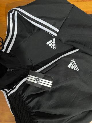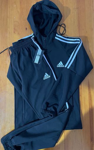 Conjunto deportivo Adidas de dos piezas. - Sudadera con capucha y cremallera completa. - Pantalón de chándal con cintura elástica. - Diseño con las icónicas tres rayas laterales. - Esta completamente nuevo lo vendo porque le va pequeño a mi hijo