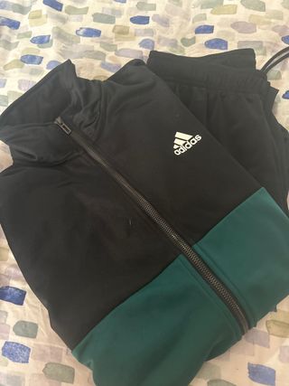 Chándal Adidas talla S, en color negro y verde. Está en muy buen estado. - Incluye chaqueta y pantalón. - Diseño bicolor.