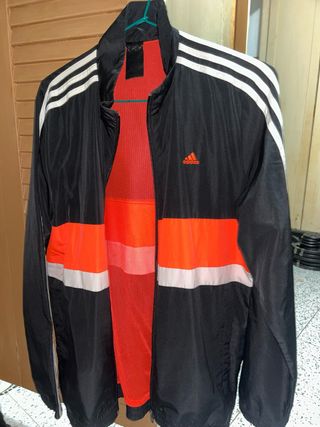 Chaqueta con cremallera Adidas de color rojo y gris oscuro, con cremallera en los bolsillos y aunque pone como talla una L es más bien una M (no me sirve). El logo delantero está un poco desgastado, por lo demás está bien, la he usado muy poco.