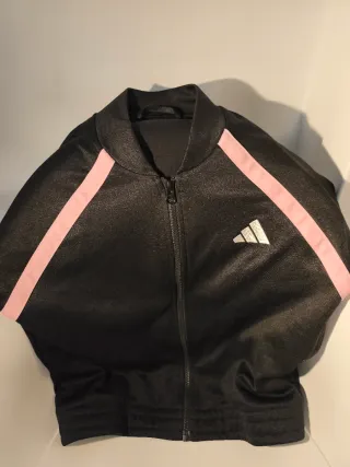 Chaqueta deportiva Adidas en color negro. Poco uso. sin pelotillas ni desgaste. Comprada por 80 €. Perfecta para chica-chico - Diseño con las tres rayas blancas. - Cremallera frontal. - Bolsillos con cremallera.