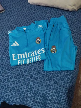 Conjunto de chándal del Real Madrid. - Diseño deportivo. - Logotipo del club. - Detalles de la marca.