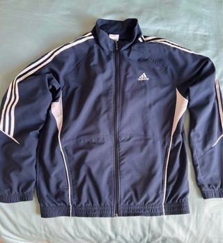 Chándal deportivo Adidas. Solo entrega en persona. - Diseño con las tres rayas icónicas en las mangas. - Cremallera frontal completa. - Capucha integrada. - Puños y cintura elásticos.