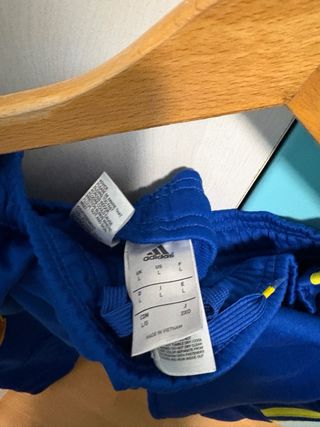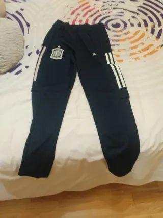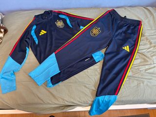 Conjunto de chándal de la selección española. Puesto solo una vez no me di cuenta que el chino me envió una talla menos de lo que pedí.. - Diseño en color azul marino. - Detalles en rojo, amarillo y azul claro. - Logo de Adidas y escudo de la selección. - Talla S.