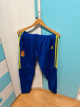 Pantalón de chándal de la marca Adidas en color azul. Presenta el escudo de la selección española y las tres franjas características de la marca en los laterales. - Diseño deportivo. - Tejido cómodo.