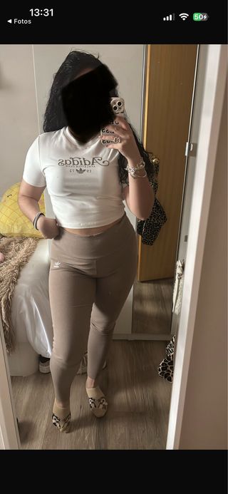 Conjunto deportivo de Adidas. - Camiseta blanca de manga corta. - Leggings beige de talle alto.
