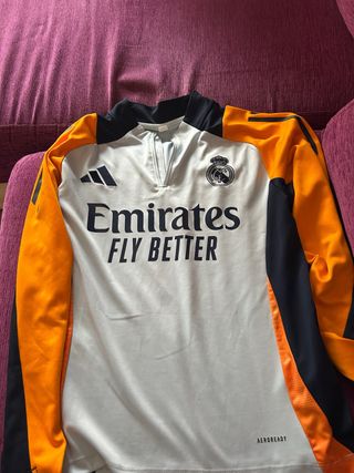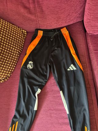 Chándal oficial del Real Madrid. - Diseño con detalles en naranja y azul marino. - Logo de Adidas y escudo del club. - Tecnología AEROREADY.