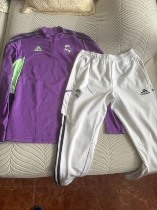 Conjunto deportivo del Real Madrid. - Diseño con las icónicas tres rayas de Adidas en las mangas. - Escudo del Real Madrid bordado en el pecho. - Cierre de cremallera parcial en el cuello. - Talla 12.