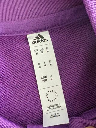 Conjunto deportivo de Adidas. - Sudadera morada con detalles en verde y azul.TALLA M - Pantalón blanco con franjas negras laterales. TALLA S