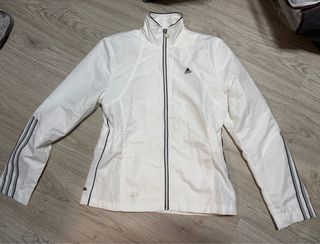Chaqueta Adidas Golf original en tonos gris claro y blanco. Talla M. Diseño elegante y ligero con cremallera completa y bolsillos laterales. Logo Adidas bordado en el bajo. Tiene leves marcas de desgaste en la zona gris del pecho y del brazo, pero en general está en buen estado. Ideal para entretiempo, golf o estilo casual deportivo.