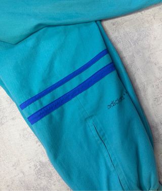 Pantalones deportivos Adidas vintage de color azul. Son pantalones de chándal, ideales para hacer deporte o para el día a día. - talla XS pero vale hasta para talla M. - Diseño clásico de Adidas con tres rayas blancas. - Cintura elástica con cordón. - Bolsillos con cremallera. - Tejido ligero y cómodo.