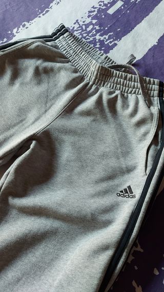 Pantalones de chándal Adidas de color gris. Son pantalones deportivos, ideales para hacer ejercicio o para el uso diario. - Están en buen estado. - Son de corte cómodo y holgado. - Tienen bolsillos laterales.
