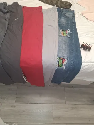 Conjunto de prendas de vestir para hombre. - Pantalón rojo - Pantalon vaquero con detalle roto de colores. - 2 Pantalones chandal gris, 1 de ellos adidas - Chaqueta marron talla 2XL - Polo rojo talla 2XL